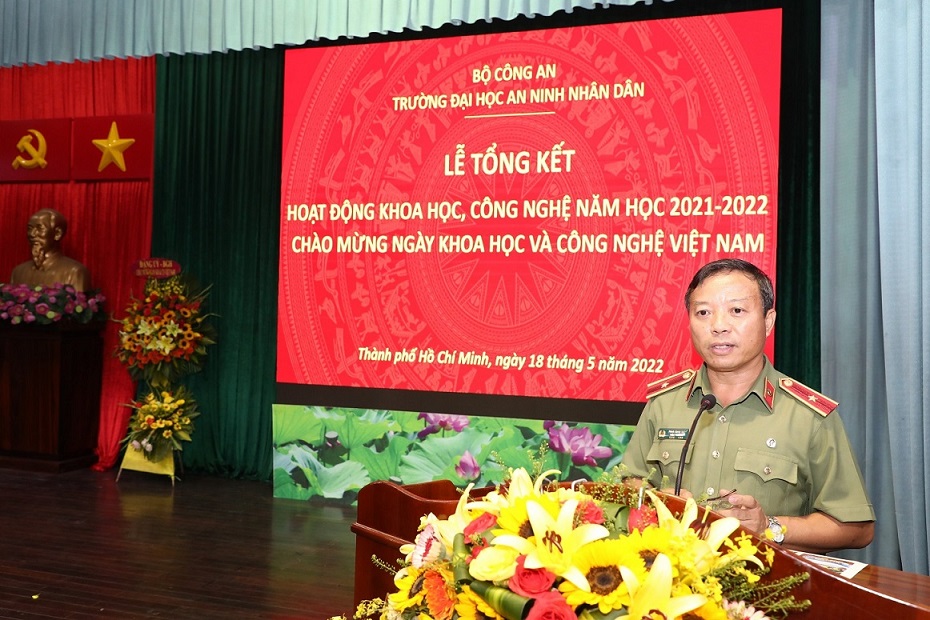 Phát biểu tại buổi lễ, Thiếu tướng, PGS.TS Phan Xuân Tuy, Hiệu trưởng Trường Đại học An ninh nhân dân gửi những lời cảm ơn các đồng chí đại biểu đã đến tham dự Hội nghị và ghi nhận, đánh giá cao và biểu dương những thành tích nổi bật trên lĩnh vực khoa học và công nghệ của Nhà trường trong năm học 2021-2022. Đó là kết quả của sự cố gắng, nỗ lực, chung sức, đồng lòng của toàn thể cán bộ, giáo viên, công nhân viên, học viên Nhà trường, nhất là đặt trong bối cảnh toàn trường phải đối mặt với đại dịch COVID-19, phải xử lý nhiều thách thức chưa có tiền lệ trong lịch sử. Tuy nhiên, càng trải qua khó khăn, thử thách thì càng thấy được ý chí, tinh thần, lòng nhiệt huyết, sức chiến đấu, sự tận tụy trong công việc của đội ngũ cán bộ, giáo viên, công nhân viên và toàn thể học viên Nhà trường. Đồng chí Hiệu trưởng tin tưởng và mong muốn rằng tinh thần đó, hào khí đó sẽ được các đồng chí tiếp tục phát huy trong năm học mới, năm học 2022-2023. Đây là năm học mà Nhà trường phải ra sức phấn đấu, nỗ lực hơn nữa, thi đua lập thành tích hơn nữa, hướng đến chào mừng kỷ niệm 60 năm Ngày truyền thống Trường An ninh Trung ương cục miền Nam, Trường Đại học An ninh nhân dân (09/10/1963 – 09/10/2023).