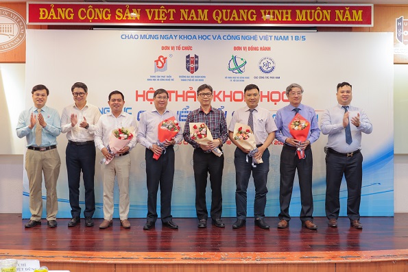 Ông Nguyễn Mạnh Cường (thứ hai từ trái sang), Phó cục trưởng phụ trách Cục Công tác phía Nam Bộ KH&CN tặng hoa cho các đại biểu, nhà khoa học tại hội thảo.