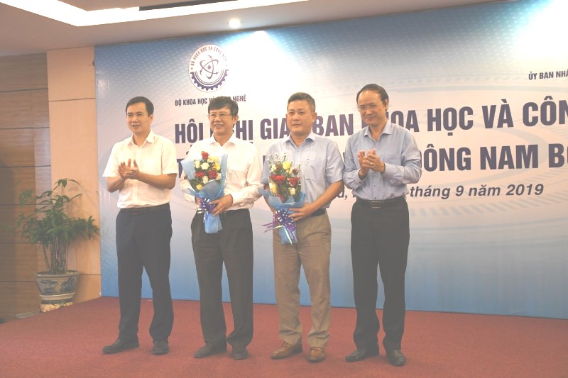 Thứ trưởng Bùi Thế Duy, Vụ trưởng Vụ Phát triển KH&CN địa phương Nguyễn Văn Liễu tặng hoa cho Sở KH&CN Bà Rịa – Vũng Tàu và Bình Phước