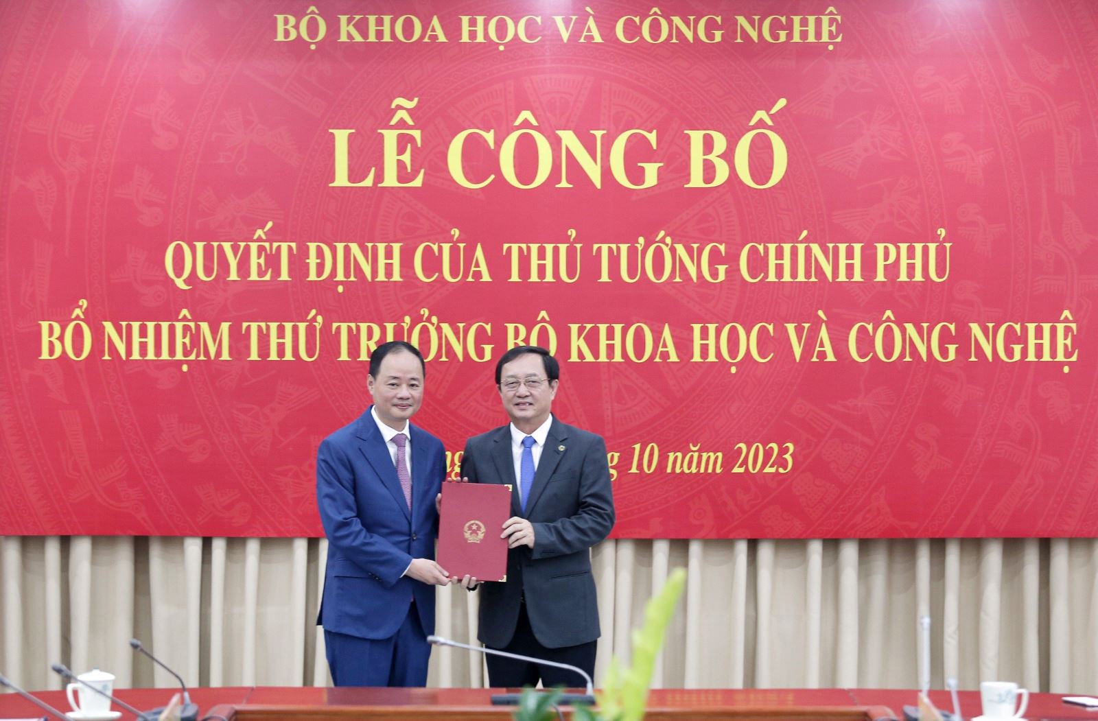 Thừa ủy quyền của Thủ tướng Chính phủ, Bộ trưởng Bộ KH&CN Huỳnh Thành Đạt trao quyết định bổ nhiệm Thứ trưởng Bộ KH&CN cho ông Trần Hồng Thái.
