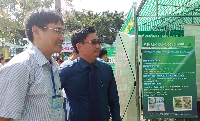 (Cục trưởng Phạm Xuân Đà tham quan các gian hàng sản phẩm công nghệ sinh học)