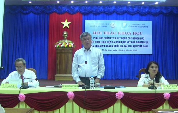 Ngày 13/11/2015, tại thành phố Cà Mau, tỉnh Cà Mau, Cục Công tác phía Nam Bộ Khoa học và Công nghệ (KH&CN) đã phối hợp với Sở KH&CN tỉnh Cà mau tổ chức hội thảo khoa học: “Phối hợp quản lý và huy động các nguồn lực triển khai thực hiện và ứng dụng kết quả nghiên cứu các nhiệm vụ KH&CN quốc gia tại khu vực phía Nam”